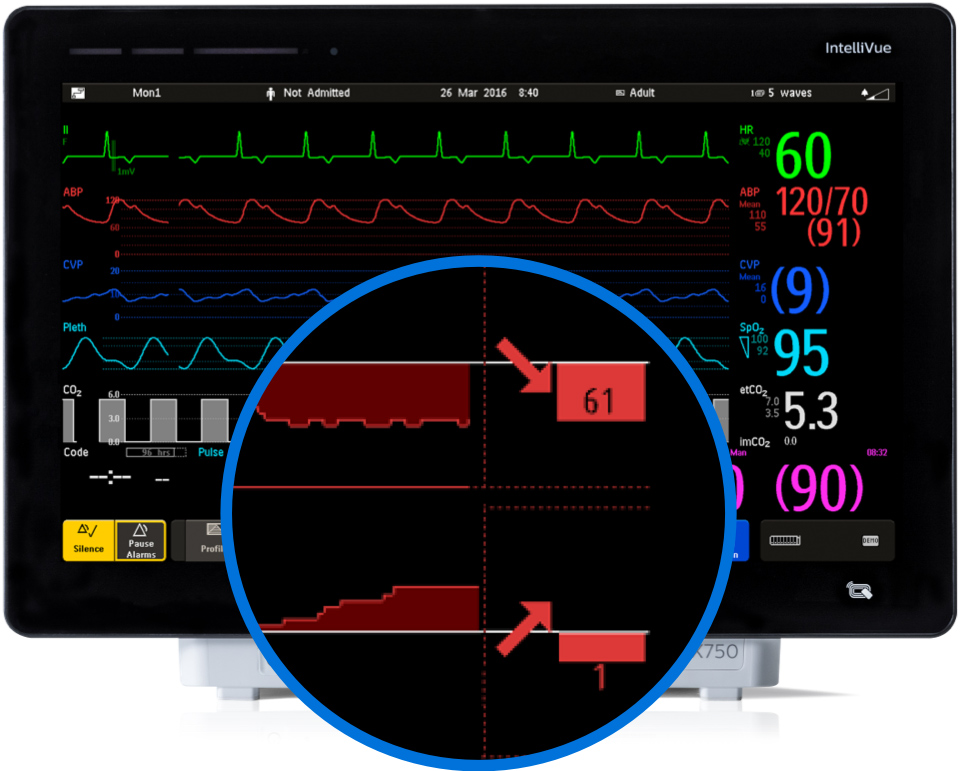 The Horizon Trends tool gives clear feedback on the patients’ current status and how they are trending for each measured parameter. Instead of using sound to alert the user to a deterioration in the patient’s condition, deviation bars and trend arrows display patient status in relation to a target goal value.